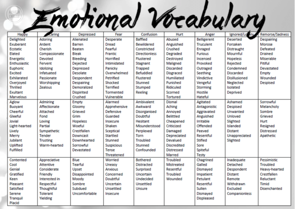 We have other pages such as a ‘dictionary of body language’ to enhance the show don’t tell principle as well as analytical sentence starters, banned words, cribs sheets for analysing tone and mood, story mountain and colour connotations.