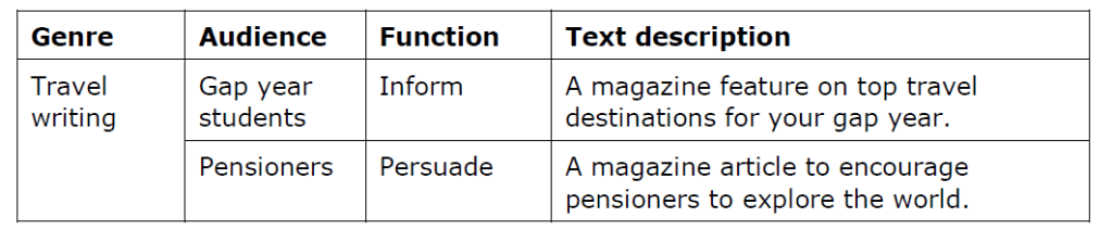 Here is further suggestions from Edexcel about your audience and how you could differentiate between your two texts for Travel Writing. This might include differentiation by audience or by purpose: