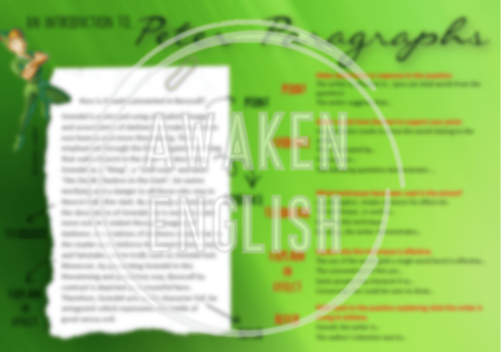 Exemplar paragraph of analysis based on the characterisation of Grendel in Beowulf with a breakdown of Point, Evidence, Technique (or Terminology), Effect and Refer Back. Useful for an introduction to analysis and support for Key Stage 3 students and part of a wider scheme of learning on Beowulf for Year 7.