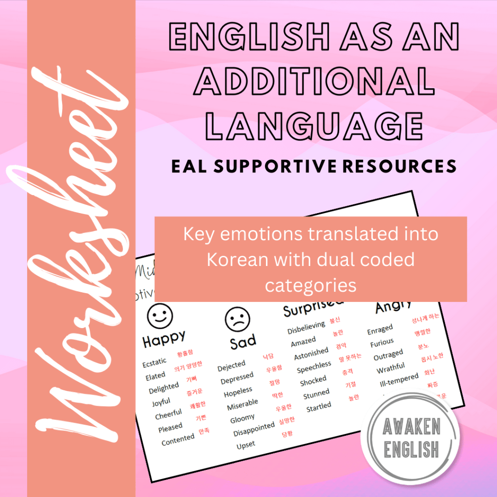 Support resource to be used in class or as a display for English as an Additional Language Students. Key emotional vocabulary translated into Korean. Can be used in conjunction with topic teaching to explore characterisation.